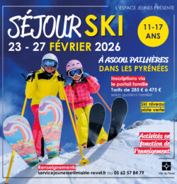 Cet hiver, l’Espace Jeunes de Revel propose aux 11-17 ans un séjour inoubliable à la montagne du 23 au 27 février : glisse, découvertes et...
