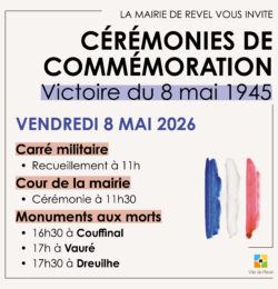 La ville de Revel invite tous ses habitants à participer aux cérémonies de commémoration de la Victoire du 8 mai 1945 qui se dérouleront le...