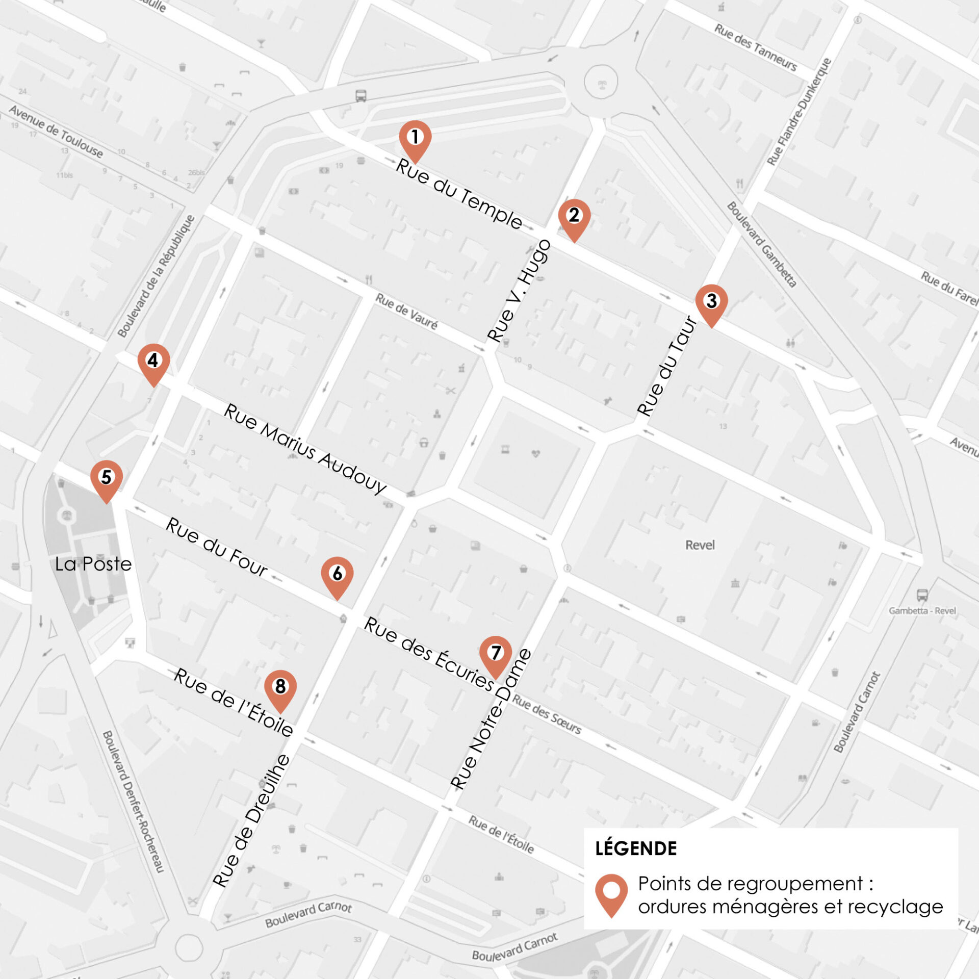 Les points de regroupement sont collectés trois fois par semaine : lundi, mercredi et vendredi. Vous pouvez y déposer vos ordures ménagères et votre recyclage. Ils sont situés :
